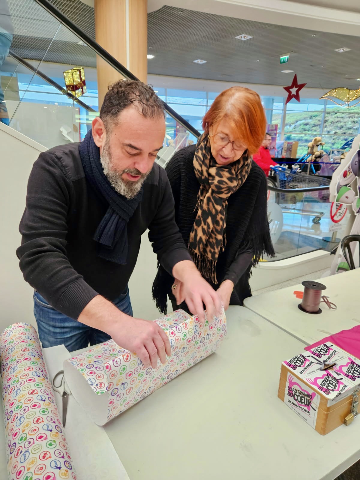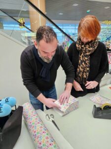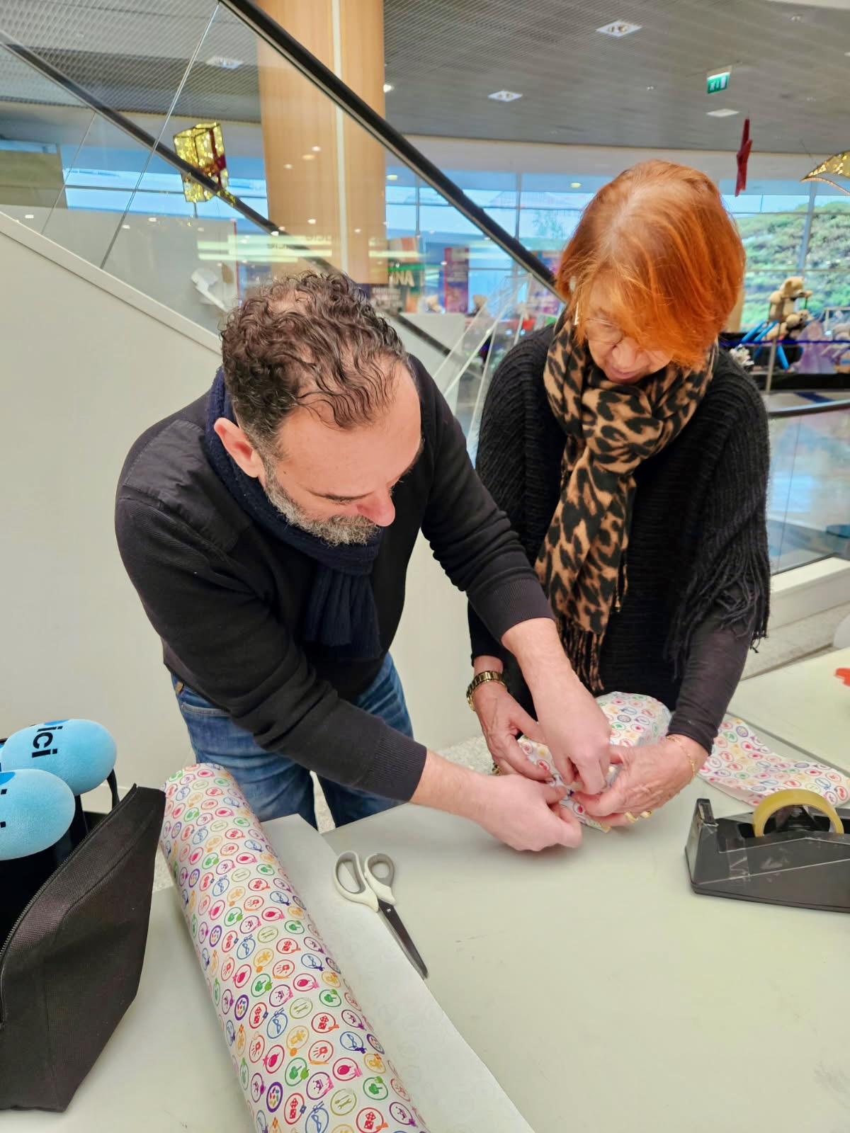 Du papier kraft et des bouts de scotch… Dans la salle, ça bruisse doucement. Un papier se plie, un ruban glisse, des sourires s’échangent. On devine l’effort de nos bénévoles qui, depuis quelques jours, se relaient pour offrir ce service d’emballage solidaire. Chaque paquet soigneusement noué devient une petite ressource supplémentaire pour soutenir les actions de l’association, là où les besoins se font sentir.
